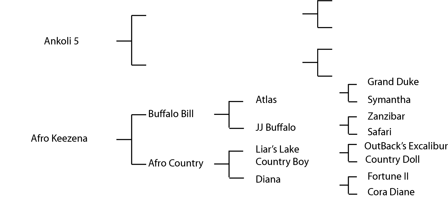 After all efforts by Darol Dickinson of Dickinson Cattle Co. to purchase this bull failed, Darol bought several straws of Ankole #5 semen. Darol retained this semen for 33 years. He then placed one straw of Ankole #5 semen in the Buffalo Bill cow Afro Keezena who's Dam was by Liar's Lake Country Boy and out of a Fortune 11 cow.